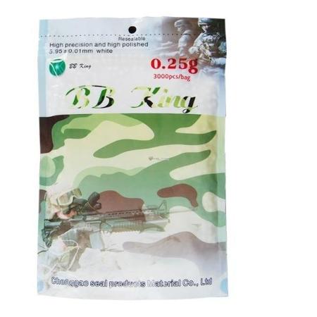 Esferas para Airsoft da marca BB King gramatura 0.25g cor branca de alta precisão com alto padrão de polimento e sem "rebardas". Pacote com 4000 unidades. É importante não reutilizar as esferas, uma vez efetuado o disparo, descarte as munições, essas poderão ter resíduos,trincos ou outros defeitos, que poderão prejudicar sua arma.